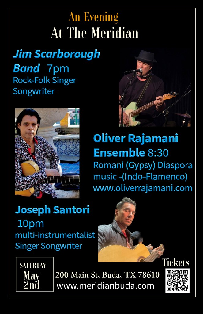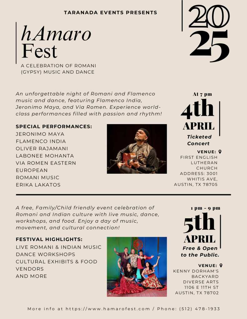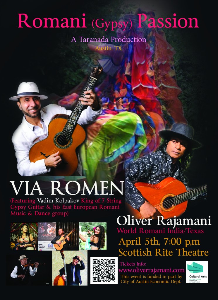 Day 1. hAmaro Fest. April 4th-Ticketed Concerts An Evening of Romani Music and Dance with Jeronimo Maya (Flamenco solo guitar from Madrid, Spain), Via Romen (Eastern European Romani music and dance featuring Vadim Kolpakov king 7 string of Romani guitar), Flamenco India (featuring Oliver Rajamani and kathak dance with Labonee Mohanta) Venue:First English Lutheran Church 3001 Whitis Ave, Austin, TX 78705 7pm to 11pm – 6:15pm Vip Meet with Artists