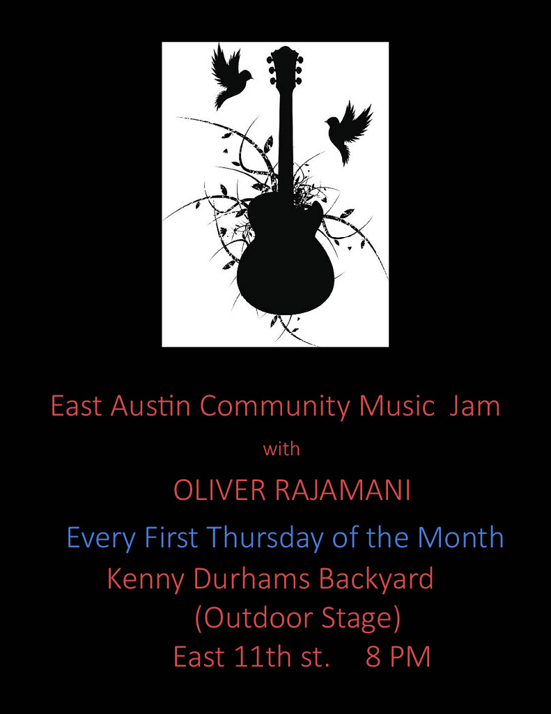 A Free East Side Austin Community Performance Every first Thursday of the month hosted by Rajamani – Austin Musicians can come and do a song on their own or jam with musicians on the open air stage – enjoy the evening with food, drinks and live music under the Texas night skies. Food Trucks, seating on the grass or chairs and tables.