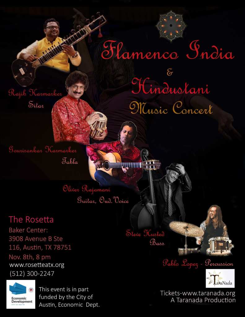 November 8th – Friday 8pm- at The Rosette- Austin, Tx Rajamani & group with Sitar Maestro Pandit Rajib Karmarker and Tabla Maestro Pandit Gourisankar Karmarker