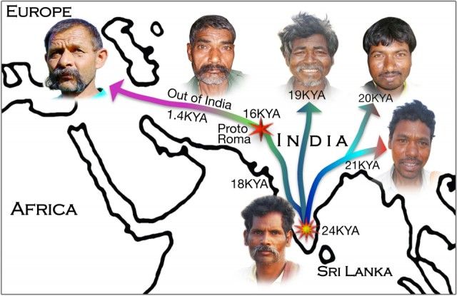 Romani Origins: India is the original homeland of the Romani people or better known as Gypsies. The Romani people are historically, genetically and linguistically connected to India. According to historical data the Roma’s first appearance in Europe was in the 14th century. The term “Gypsy” comes from the misbelief Europeans had that the Roma were Egyptian. There were other misbeliefs the Europeans held of the Roma that lead to many persecutions the Romani populations faced over the hundreds of years since their arrival in Europe. Below is the latest genetic and most accurate map of the Romani genetics origins provided to us by worlds leading geneticist Dr. Kumaraswamy Thangaraj. Northwest India being the cultural, linguistic homeland of the Romani while South Indian Dravidian genetics being the ancient origin in the Romani genetic trail.