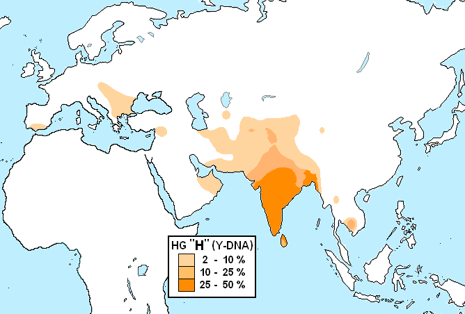 Map below shows Haplogroup H- found in South Asians (predominantly in South Indian Dravidian populations) and Romani people of Europe.